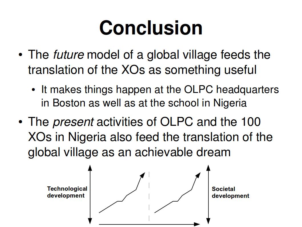 This, however, does not change that looking at the horizon of a Global Village projected ahead of the XO laptops in Nigeria one will discover that this model of the future actually serves an empirical purpose. It feeds the translation of the XOs as something useful and it makes things happen at the OLPC headquarters in Boston as well as at the school in Nigeria.