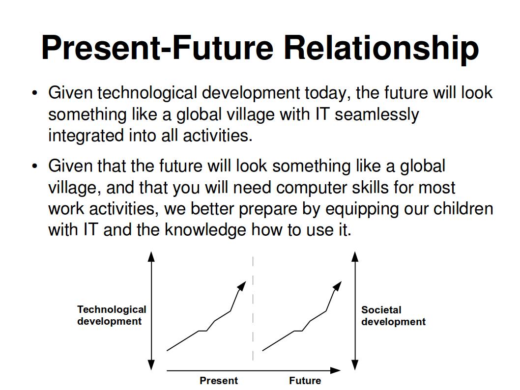 2. The second is that given that the future will look something like a global village, and that in that village you will need computer skills for most work activities, we better prepare by equipping our children with IT and the knowledge how to use it.